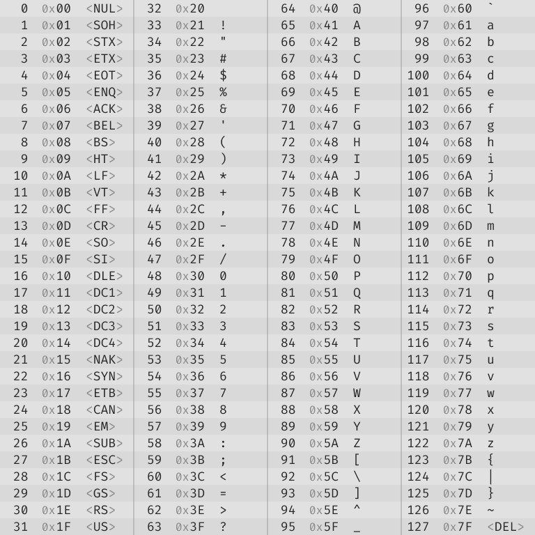 - 왼쪽 열부터 순서대로 십진수, 십육진수, 문자